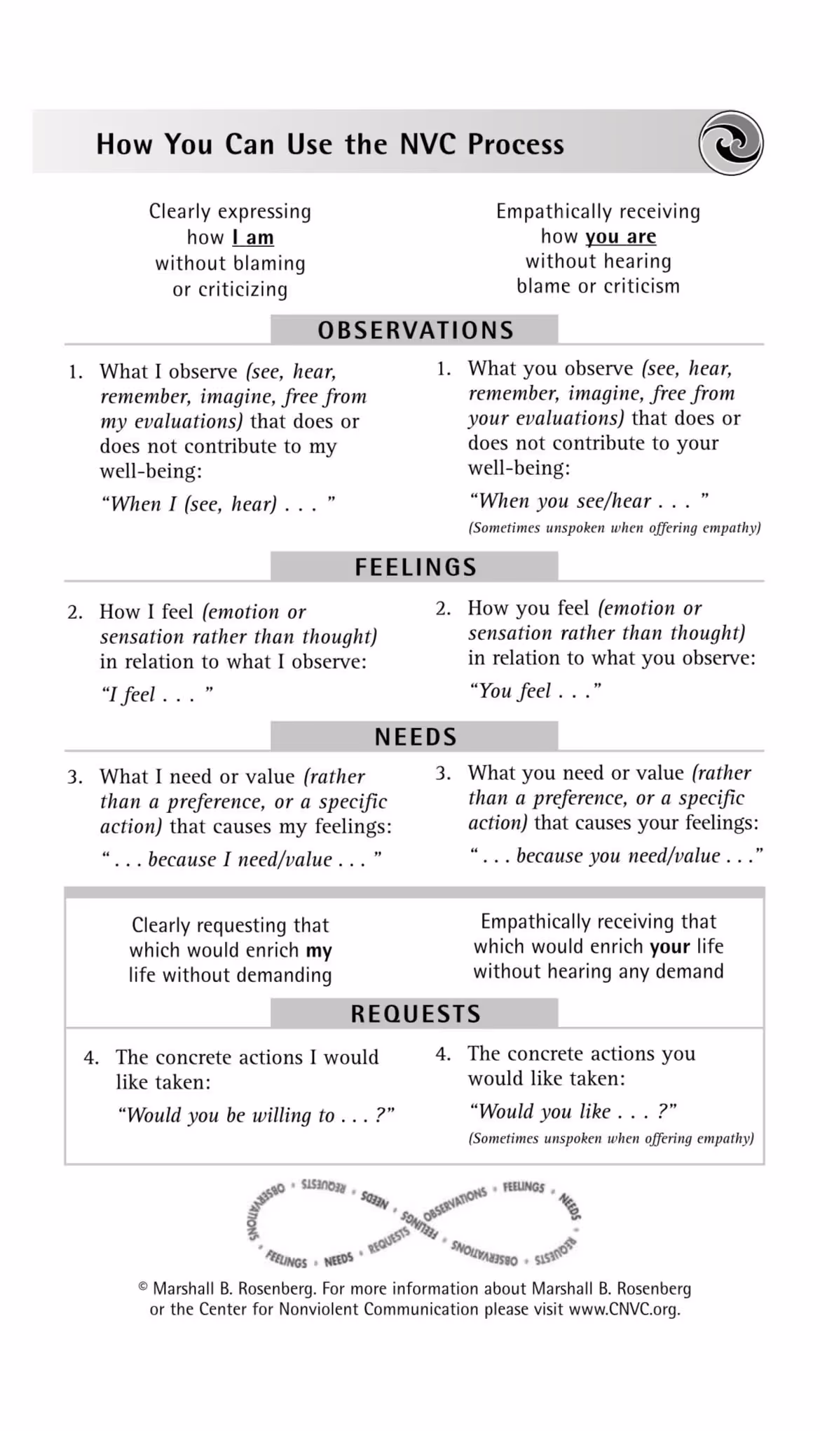 The idea is to clearly express how you are without blaming or criticizing, and as well empathetically receiving how you are without hearing blame or criticism. Let me explain a bit more about those 4 parts.