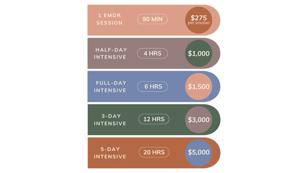 All EMDR intensives include resources, assessments, and a personalized treatment workbook. Additionally, you will receive snacks and drinks to ensure you feel supported throughout the process.